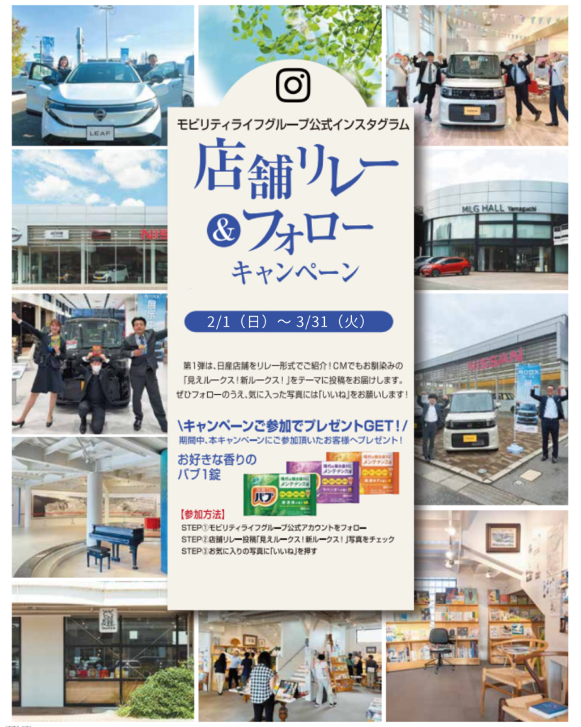 2026年2月1日(日)~3月31日(火)の期間中、モビリティライフグループ公式Instagramにて「店舗リレー&フォローキャンペーン」を実施しております。